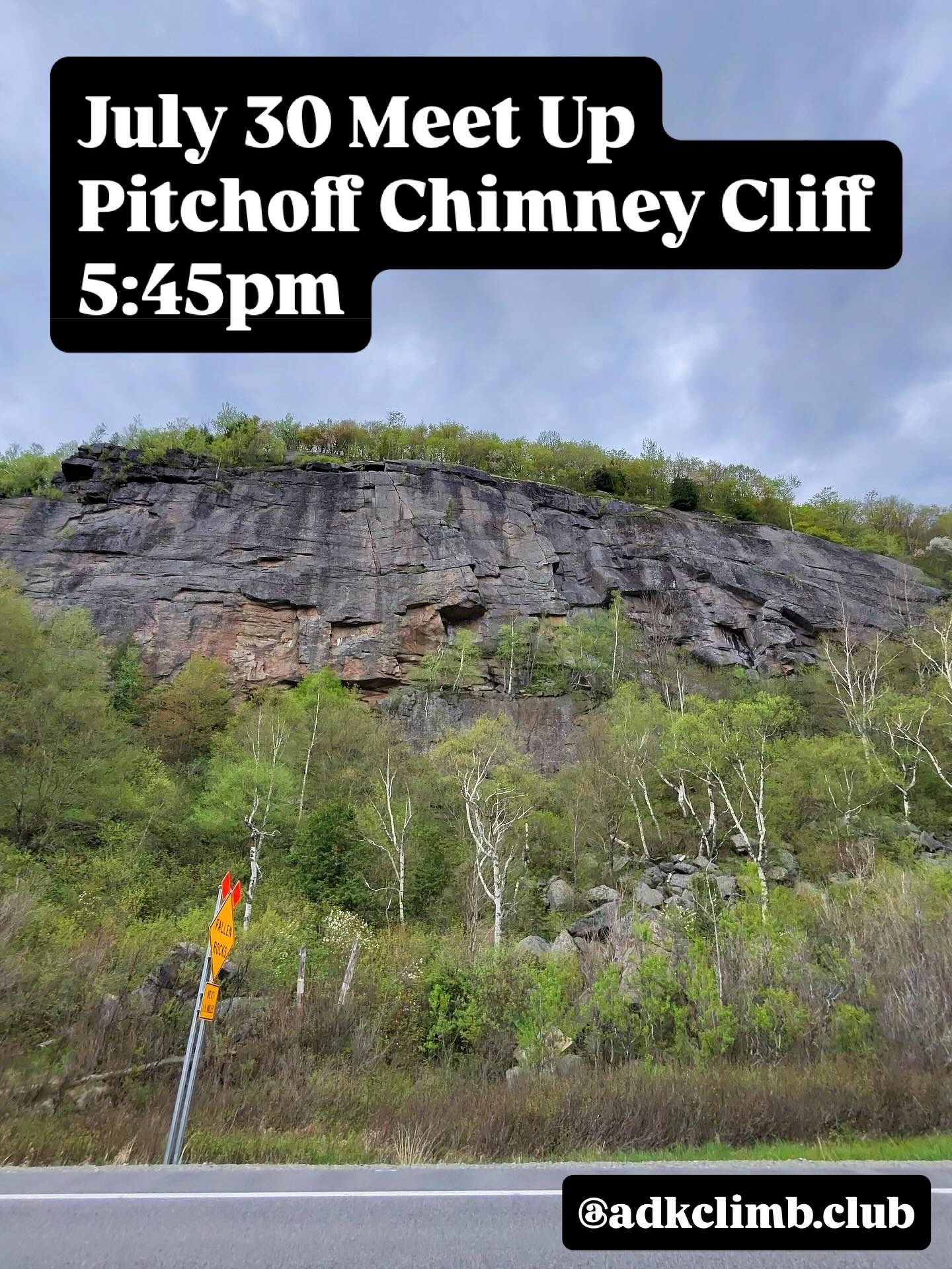 See you tomorrow night, July 30, for our weekly meet up! Weâre climbing at the standout Pitchoff Chimney Cliff by Cascade Lakes. Thereâs something for everyone, whether is warming up on the Practice Wall, multi-pitching on one of the many routes that top out the cliff, or throwing yourself at the classic single pitch Roaches on the Wall (5.10).