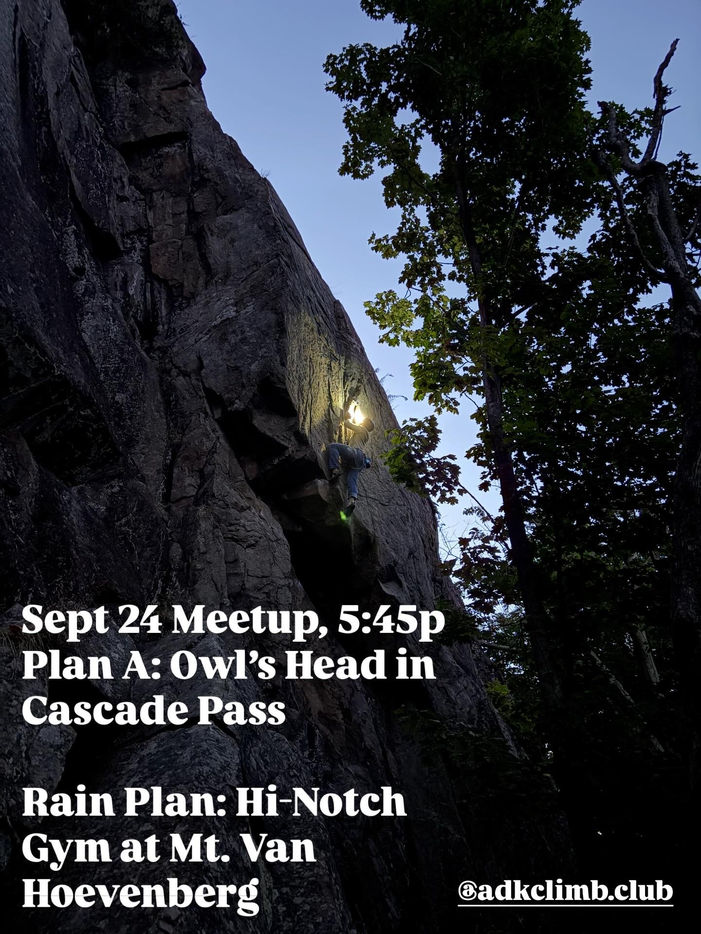 Come hang with us at Owlâs Head Mtn for some chill crack climbs in a gorgeous setting. Or if the rain hits, find us at @vanhoevenberg for the Hi-Notch Climbing Gymâs after-hours ($7).